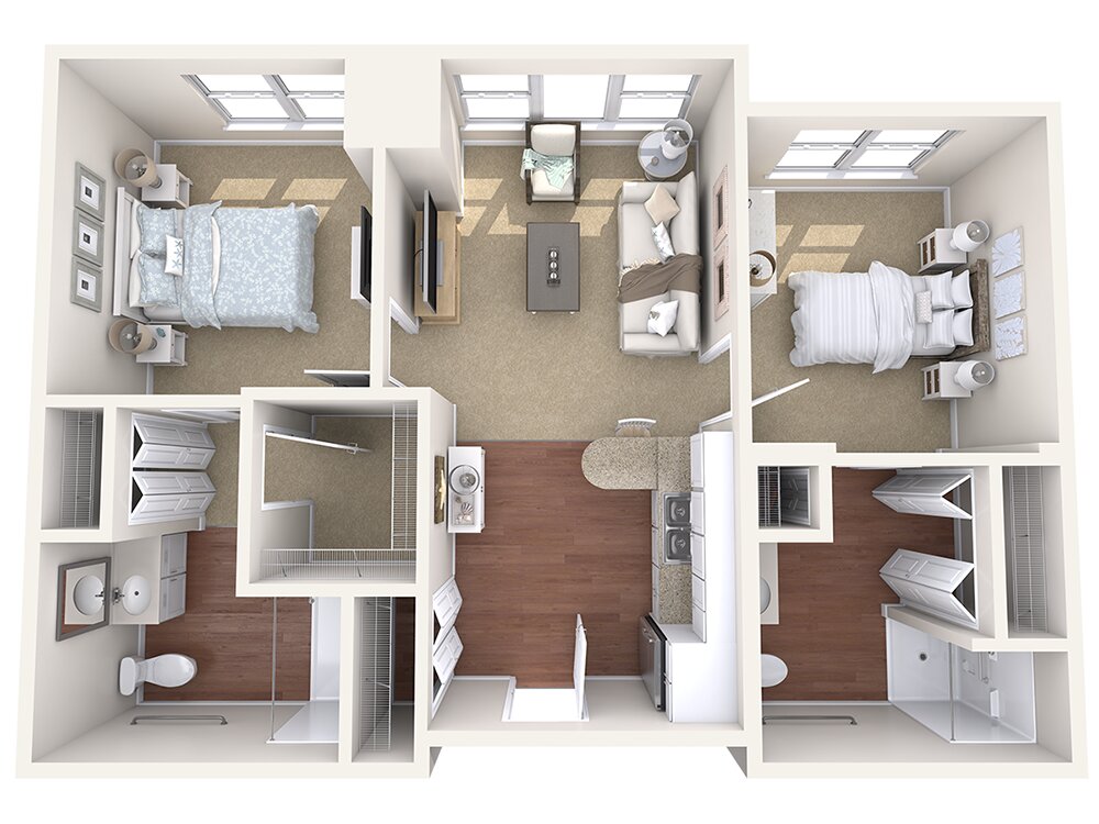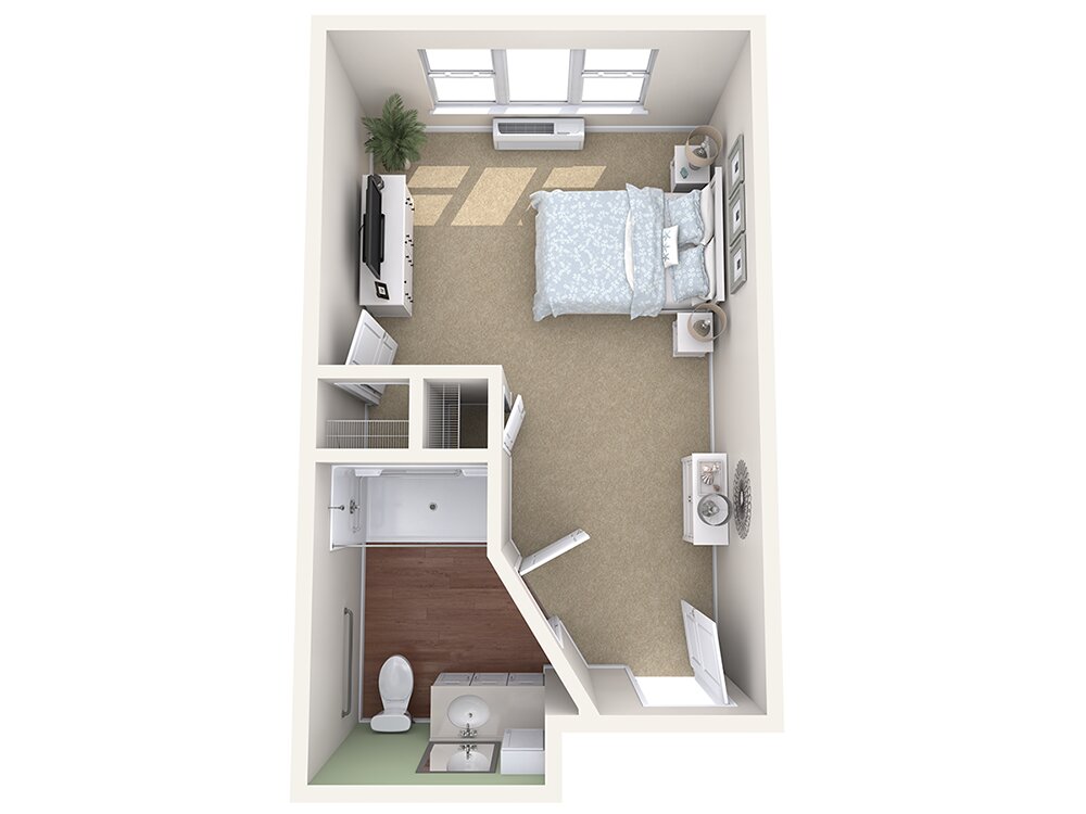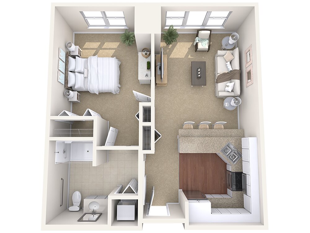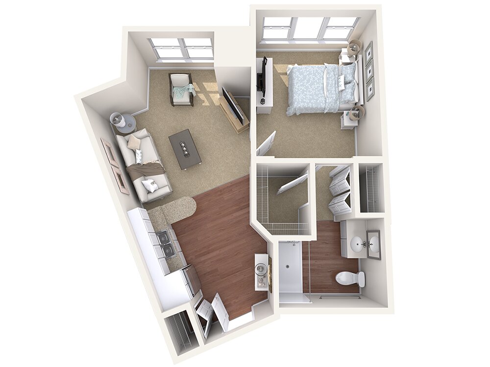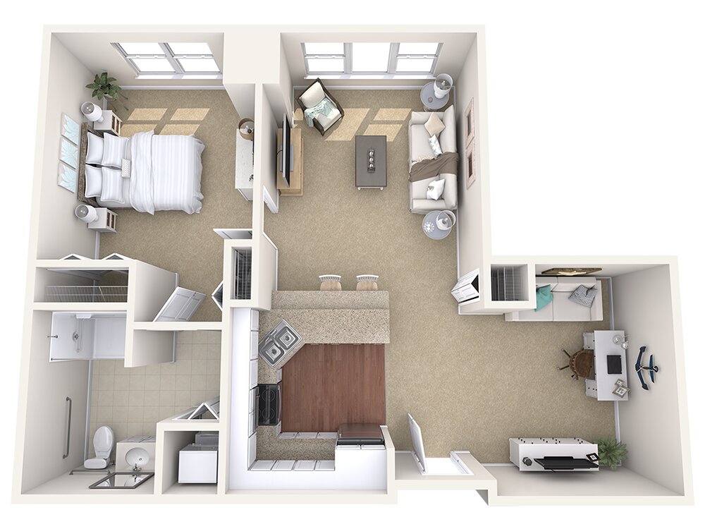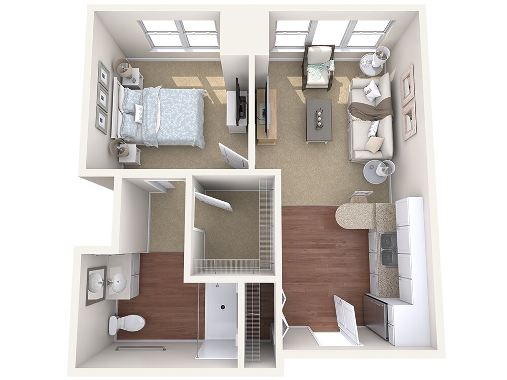 Our one- and two-bedroom apartments feature an open layout with a stylish kitchenette, oversized windows that bring in abundant natural light, and a spacious bathroom for added convenience. Each residence offers a bright and airy atmosphere with generous closet space, creating a comfortable retreat to relax and recharge. Two-bedroom apartments provide the most expansive living option, combining modern finishes with thoughtful details that enhance both comfort and everyday ease—perfect for residents who appreciate extra space.